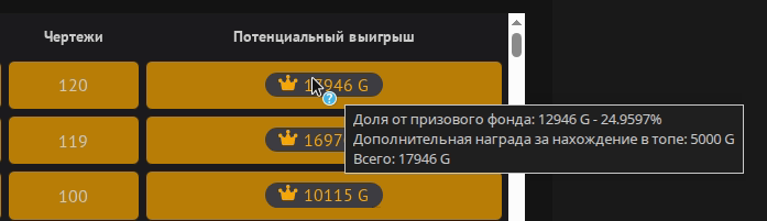 Просто наведите курсор мыши на число золота в соответствующей колонке турнирной таблицы. Там подробно будет расписана структура потенциального выигрыша участника.